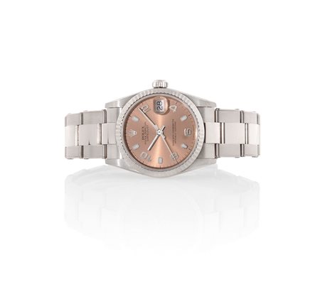 C. n. U654991 in oro bianco 18 kt con fondello e corona a vite, lunetta godronata e vetro zaffiro. Q. rosa con indici e numeri arabi applicati, secondi al centro e data al 3. M. a carica automatica. Bracciale Oyster in oro bianco 18 kt. Quadrante, cassa, movimento e bracciale firmati.