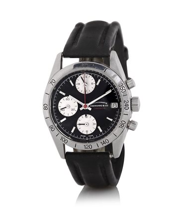 C. stainless stell with round buttons and bezel with tachymetre scale. D. bicolor black and silvered with applied indexes, luminous hands, 60 minutes register by central hand, 12 hours register at 6, 24 hpur at 12, date at 3. M. self-winding. Dial, case and movement signed. Accompanied by Eberhard strap and stainless steel buckle.