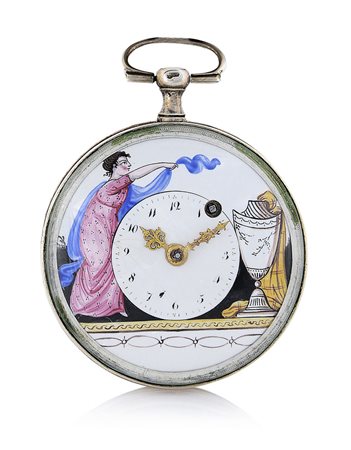 C. in argento liscia. Q. in smalto dipinto con numeri arabi. M. firmato con scappamento a verga, carica a chiavetta.