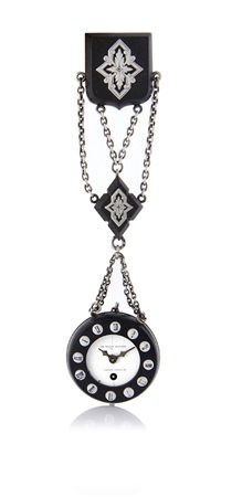 C. in ebano con monogramma in argento applicato, numeri romani su semisfere in smalto applicate sulla lunetta. Q. in smalto con numeri arabi e foro di carica al 6. M. con scappamento a cilindro, carica a chiavetta. Chatelaine in argento con due corpi in ebano e decoro applicato in argento. Quadrante, cassa e movimento firmati.