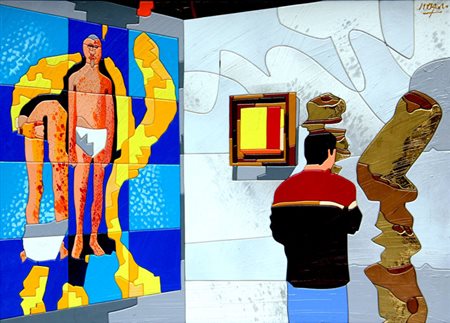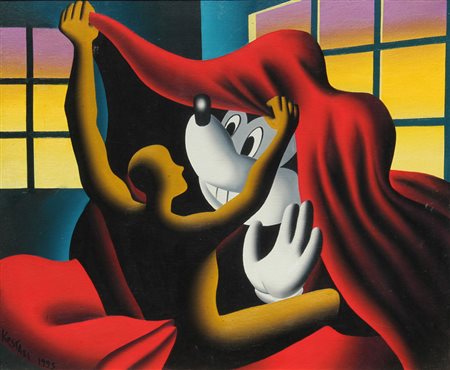 Lotto 7 Mark KOSTABI Los Angeles 1960 Unbeknowst, 1993, olio su tela, cm. 51 x 61, Firma, data 'Kostabi, 1993' (in basso a sinistra) #Firma, titolo, data, misure, data, scritta 'Kostabi, Unbeknowst, 1993, 20x24', 5-25-93, Agglutinatime' (al retro) Autentica dell'artista su fotografia, con data Bologna 30.01.2005 #Autentica dell'artista su fotografia