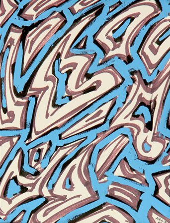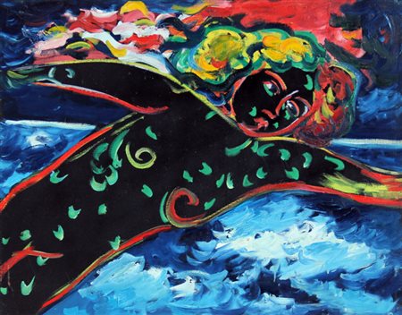 Lotto 12 Gioppe DI BELLA Trapani, 1945 - Erice, 2007 A ritmo di blues, 1987, tecnica mista su tela, cm. 69 x 99, Firma, titolo, misure, firma, data 'Gioppè Di Bella, A ritmo di blues, cm 100x70, Gioppè, 1987' (al retro) Autentica dell'artista su fotografia