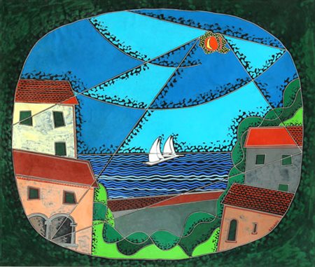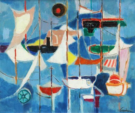 Lotto 19 Enrico PAULUCCI Genova 1901 - Torino 1999 Porto Celeste, olio su tela, cm. 50 x 59, Firma 'Paulucci Enrico' (in basso a destra) #Firma, titolo 'Paulucci, Porto Celeste'; #etichetta e timbro della galleria San Marco, Pescara (al retro) Autentica dell'artista su fotografia
