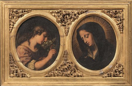 coppia di dipinti ad olio su tela ovali, cm 32x26,5 ciascuno, in un'unica cornice intagliata e dorata cm 39,5x65
