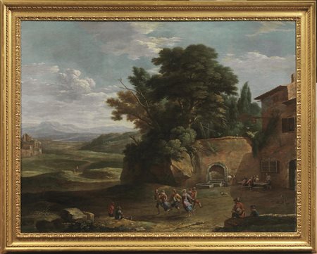 Dopo una prima educazione nella bottega del padre, Pieter III, pittore di paesaggi e di scene di interno, Gaspar de Witte partì per l’Italia, meta del viaggio di formazione consueto ai pittori oltremontani, raggiungendo Roma intorno alla metà degli anni Quaranta. Documentato nel 1646 nella associazione che a Roma riuniva i pittori fiamminghi, i Bentvueghels, e in Francia nel 1648, tornò ad Anversa alla morte del padre e nel 1650 si iscrisse alla corporazione dei pittori della città natale. A partire da quell’anno e fino alla morte avvenuta nel 1681 De Witte applicò il suo versatile talento ai generi più richiesti dalla borghesia cittadina per la decorazione di residenze private, dipingendo interni di gallerie con figure allegoriche, e grandi paesaggi campestri animati da scene di vita quotidiana e ornati talvolta da elaborate fontane classicheggianti. Quasi sempre firmati e spesso accompagnati dalla data, i suoi dipinti costituiscono un esempio tipico della moderna pittura di paesaggio fiorita nelle Fiandre alla metà del secolo e fino al Settecento grazie a personaggi come Jacques d’Arthois e Cornelis Huysmans, che di De Witte fu appunto allievo. Autore delle sue figurine fu occasionalmente Anton Goubau, suo concittadino e come lui presente a Roma alla metà degli anni Quaranta. Si deve anche al ricordo della pittura dei cosiddetti bamboccianti, a cui Goubau si era accostato negli anni romani, oltre che all’esempio di David Teniers, la creazione di scene che, come quella qui offerta, propongono un’immagine lievemente edulcorata della vita campestre, in curioso anticipo sulla visione arcadica che Anesi e Monaldi ne offriranno nel Settecento.