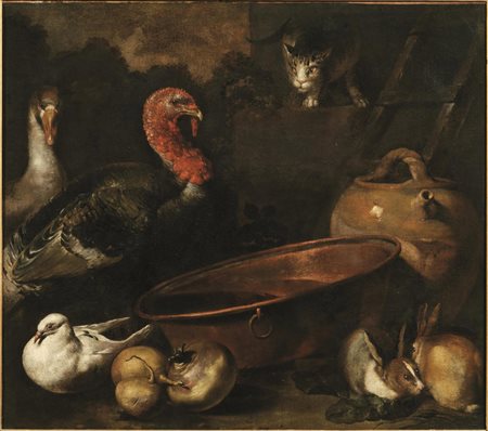 NATURA MORTA CON ANIMALI DA CORTILE E PAIOLO IN RAME