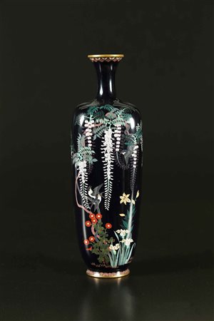 Lotto 1 Arte Giapponese Vaso cloisonné in rame smaltato Giappone, periodo Meiji 1868 - 1912, tardo XIX secolo . -. Cm 3,90 x 24,50. Su uno sfondo blu scuro si stagliano fiori tra cui il glicine, il crisantemo, l'iris ed il giglio e tre rondini, tutti elementi che contraddistinguono la stagione primaverile.