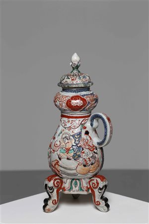 Lotto 2 Arte Giapponese Vaso tripode Imari in ceramica Giappone, XVIII secolo. . Cm 36,00. Imponente vaso tripode completo di coperchio. L'affollata decorazione in rilievo tattile prevede grandi cartucce con figure, festoni ed elementi simbolici come la carpa. Altri animali affollano la zona rigonfia in prossimità del coperchio.