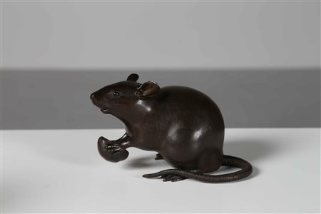 Lotto 3 Arte Giapponese Topo in bronzo firmato alla base Giappone, XIX secolo. -. Cm 16,00 x 10,40. Raffinata e realistica fusione in bronzo raffigurante un simpatico topino con una castagna, realizzata in lega rossastra, tra le zampe anteriori. La base mostra la firma dell'artista: Kouji Saku (fatto da Kouji) Qualche mancanza nelle zampe.