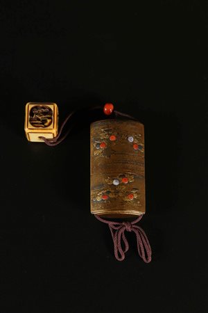 Lotto 4 Arte Giapponese Inro Giappone, periodo Edo 1603 - 1867, XIX secolo Legno laccato, dorato e decorato con la tecnica della pittura cosparsa piatta . -. Cm 4,00 x 7,00. Scatola porta sigillo composta da quattro scomparti decorati in lacca dorata con intarsi in madreperla e rosso corallo a motivo vegetale e di crisantemi. Il finale è costituito da un netsuke quadrato intagliato in avorio, decorato con intarsi di padiglioni tra i pini.