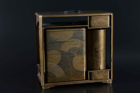 Lotto 5 Arte Giapponese Set da picnic (Sagejubako) con decorazione a motivo di ventagli pieghevoli Giappone, periodo Edo 1603 - 1867, prima metà XIX secolo Legno laccato dorato . -. Cm 34,00 x 33,30 x 19,00. Servizio da picnic composto da un doppio flacone da saké con decoro di anatre e crisantemi, due vassoi, una scatola porta cibo composta da scomparti impilabili, tutto decorato con motivo di ventagli pieghevoli ed inserito all'interno di un telaio abbellito da simili motivi. Manca il vassoio nell'area superiore destra.