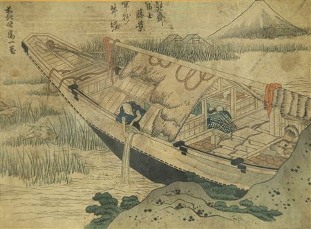 Lotto 6 Arte Giapponese Katsushika Hokusai (1760 - 1849) Stampa raffigurante degli uomini in barca Giappone, periodo Edo Xilografia, inchiostro e colori su carta . . Cm 20,00 x 15,00. Katsushika Hokusai fu un grande pittore ed incisore del periodo Edo, divenuto celebre soprattutto per la serie di stampe sulle vedute del Monte Fuji. I suoi lavori furono fonte d'ispirazione per i coevi impressionisti francesi. Cornice presente
