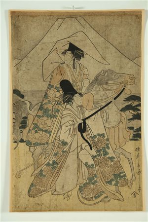 Lotto 8 Arte Giapponese Rekisentei Eiri (1789 - 1801) Il Viaggio di Narihira verso l'Oriente, parte centrale di un trittico Giappone, periodo Edo, tardo XVIII secolo Xilografia, inchiostro e colori su carta . . Cm 20,00 x 30,00. Importante xilografia raffigurante un passaggio del nono capitolo de "I racconti di Ise", un romanzo poetico fatto di racconti amorosi ed avventure, pietra miliare della letteratura classica nipponica. In questo passaggio la protagonista Narihira, stanca della sua vita nella capitale, intraprende, con due fidate amiche, un viaggio verso le province orientali alla ricerca di un'esistenza più pacifica. La stampa qui proposta è la parte centrale di un trittico che si può vedere per intero al Metropolitan Museum of Art di New York (Accession Number: JP1789)