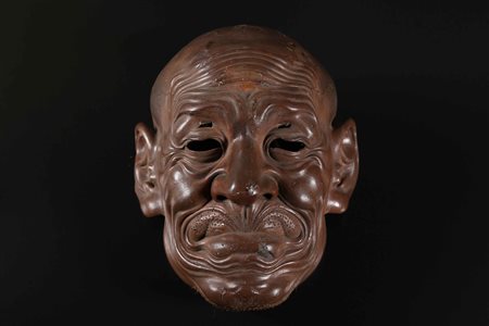 Lotto 10 Arte Giapponese Maschera Gigaku in legno Giappone, periodo Edo, XVIII - XIX secolo. . Cm 30,00. Maschera raffigurante un uomo anziano (Jo). I peli di barba e baffi, originariamente inseriti negli appositi fori, risultano ora tagliati. Antica etichetta museale o di vecchia collezione all'interno. Il teatro Gigaku è un genere, ormai estinto. di dramma mascherato importato in Giappone durante il periodo Asuka.