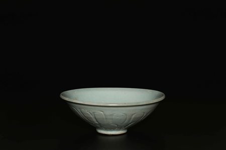 Lotto 11 Arte Cinese Coppa in proto porcellana Cina, dinastia Song, XII secolo. . Cm 16,50 x 6,00. Coppa poggiante su disco con bordo leggermente estroflesso, presenta incisioni a petalo sull'esterno e incisioni a motivo vegetale stilizzato all'interno. Velato craquelé.