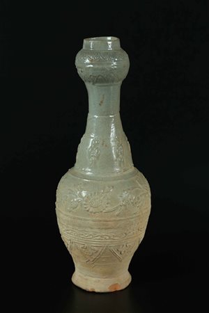 Lotto 12 Arte Cinese Vaso funerario Song in terracotta invetriata Cina, dinastia Song. -. Cm 7,00 x 28,30. Vaso poggiante su disco, decorato con motivo floreale sulla spalla e con piccoli personaggi stilizzati alla base del collo, terminante con testa d'aglio decorata a motivo fitoforme e con stretta bocca cilindrica. Una vetrina verde grigio ricopre la parte superiore dell'oggetto. Anfore di questo tipo venivano aggiunte al corredo funerario per contenere sementi che dovevano accompagnare il defunto nel suo viaggio. Tappo mancante.
