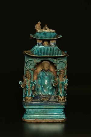 Lotto 13 Arte Cinese Modello di pagoda in ceramica turchese con attendenti Cina, dinastia Ming, XVI secolo. . Cm 13,00 x 30,00. Modellino di edificio con eminenza assisa in posizione centrale e due attendenti ai lati. Il retro, alcune parti dell'edificio e dei corpi sono lasciate senza invetriatura.