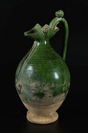 Lotto 15 Arte Cinese Brocca in terracotta invetriata di verde Cina, dinastia Song. -. Cm 6,70 x 24,00. Versatoio poggiante su disco caratterizzato da un ampio corpo globulare terminante in uno stretto beccuccio su cui si innesta l'ansa con poggiadito a forma di testa di animale. L'altro lato dell'oggetto mostra una decorazione a "spina" terminante con una testa bovina in rilievo. La spessa vetrina verde lascia scoperta solo la zona inferiore.