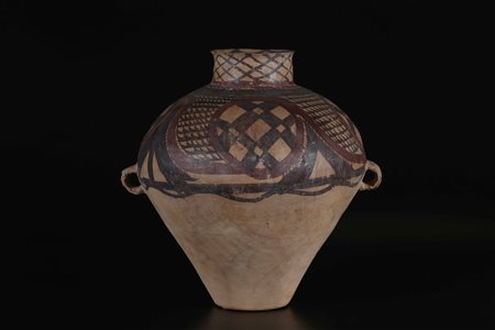 Lotto 17 Arte Cinese Vaso Neolitico cultura Yangshao Cina, periodo Neolitico, 3300 - 2000 AC. . Cm 39,00. Vaso in terracotta dipinta con ampia spalla ricurva, collo dritto e due anse ad occhiello. Nella parte superiore reca decori a scaglie, losanghe, chevron e griglie entro cartucce circolari rosse. La forma e la decorazione geometrica pongono il vaso in diretta relazione con la fase Majiayao (3300 - 2000 AC) della cultura Neolitica Yangshao (5000 - 2500 AC) insediata nel bacino centrale del Fiume Giallo, principalmente nelle province di Henan, Shaanxi e Shanxi. L'oggetto è corredato di analisi termoluminescenza.