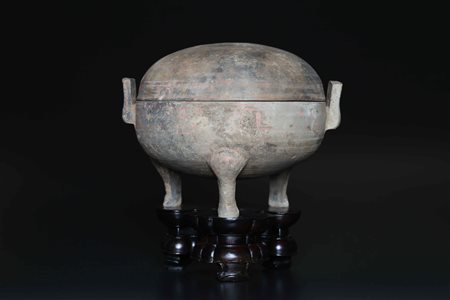 Lotto 19 Arte Cinese Contenitore tripode Han in terracotta con tracce di policromia Cina, dinastia Han, III sec AC - III sec. AD. . Cm 23,00 x 16,00. Bella scatola a sezione circolare poggiante su tre piedi e costituita da due parti combacianti e due anse. L'oggetto reca ancora evidenti tracce dell'originale policromia. L'opera è accompagnata da base lignea costruita successivamente e appositamente che misura 7x17x17 cm. Effettuata la termoluminescenza in data 12/11/1998 dalla ditta Arcadia, come da documentazione allegata all'opera.