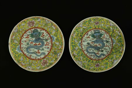 Lotto 20 Arte Cinese Coppia di tonde placche in porcellana dipinta con dragone centrale e fiori su fondo giallo Cina, dinastia Qing, periodo Guangxu, XIX secolo. . Cm 21,50.