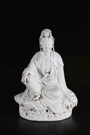 Lotto 21 Arte Cinese Guanyin in porcellana bianco di Cina Cina, periodo Repubblica, XX secolo. . Cm 38,00. Scultura raffigurante Guanyin seduta su supporto roccioso, la morbida ed ampia veste lascia intravvedere la collana sul petto.