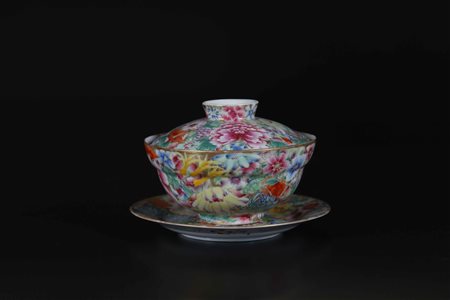 Lotto 22 Arte Cinese Coppa in porcellana con coperchio e piattino millefiori Cina, dinastia Qing, epoca Guangxu 1875 - 1908. . Cm 12,50 x 10,00. Grazioso set di tazza con coperchio e piattino decorato con vivace fantasia millefiori. Presenta marchio Guangxu sul retro del piatto, sulla base della tazza e sul coperchio.