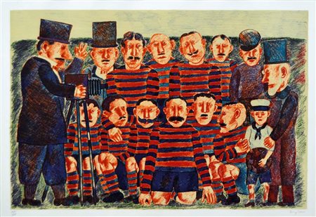 Lotto 3 BORGHESE FRANZ Roma 1941 - 2005 Squadra di calcio litografia es. XXV/XXV 50x70 firma in basso a destra tiratura in basso a sinistra