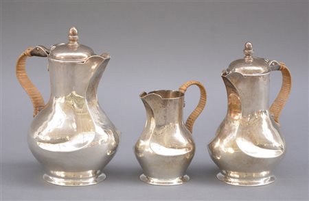 Lotto 404 Servizio "egoista" in argento composto da una teiera, una caffettiera ed una lattiera in argento con manici rivestiti in midollino. Titolo 925, Italia anni 40