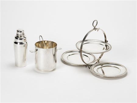 Lotto 405 Lino Sabattini (1925) - e altri. Lotto composto da un portaghiaccio in metallo argentato Christofle, uno shaker di Lino Sabattini per Christofle uniti ad un'alzata con tre piatti apribile , in metallo argentato (lievi difetti)