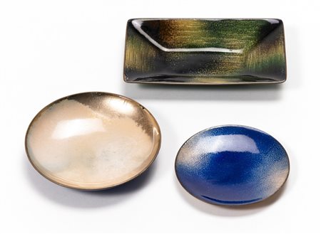 Lotto 412 Paolo De Poli (Padova 1905 - 1966) - Lotto di due piatti circolari e uno rettangolare in rame smaltato blu, verde e ocra. Firmati "De Poli" sotto la base (misure varie) (difetti)