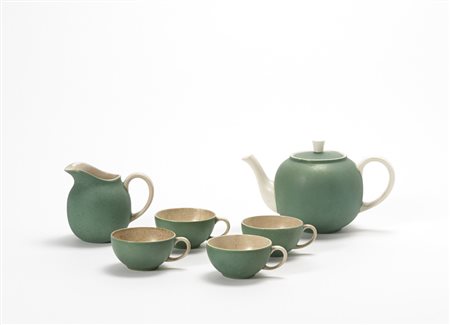 Lotto 413 Manifattura Richard-Ginori S. Cristoforo. Servizio da te e caffe in terraglia formata a stampo e smaltata in bianco e verde opaco, composto da teiera, lattiera e quattro tazzine. Marcata in verde sotto la base "Richard-Ginori Fabbricato in Italia", con monogramma e numerale "5023". Milano 1937 (difetti)