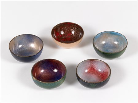 Lotto 414 Paolo De Poli (Padova 1905 - 1966) - Lotto di cinque bomboniere in rame smaltato di colori diversi. Firmate "De Poli" sotto la base (d cm 6,5)(difetti)
