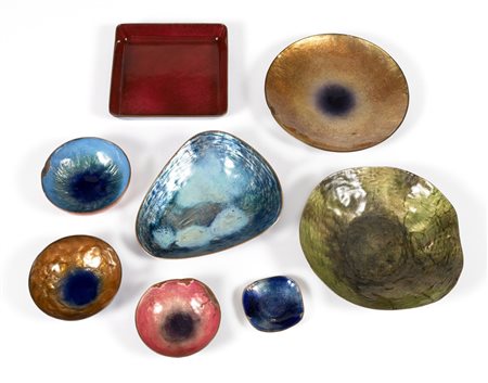 Lotto 419 Paolo De Poli (Padova 1905 - 1966) - Lotto di otto ciotole di forme e dimensioni diverse in rame smaltato. Firmati "De Poli" sotto la base, una reca la scritta "Paolo de Poli Natale 1956" (difetti)