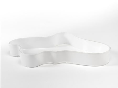 Lotto 420 Alvar Aalto (1898 - 1976) - Vaso basso modello "474". Produzione Iittala, Finlandia 1990.Vetro incamiciato incolore e bianco, prodotto a stampo. Firmato e datato a punta sotto la base. (cm 38x28, h cm 5))