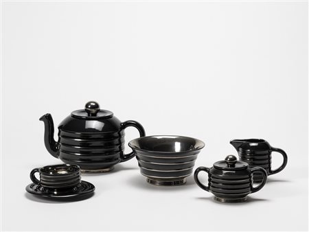 Lotto 421 Manifattura Rometti. Servizio da tè in terraglia smaltata in nero e argento composto da: teiera, lattiera, zuccheriera, dodici tazze con piattini e ciotola, Umbertide 1933-1935. Iscritto sotto la base "sacru rometti"