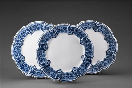 Lotto 1 Manifattura del secolo XVIII. Gruppo di tre piatti in maiolica con bordo sagomato decorato nei toni del blu a motivi vegetali (difetti e restauri) (d. cm 37) Group of three 18th-century majolica plates with decorations (defects and restorations)