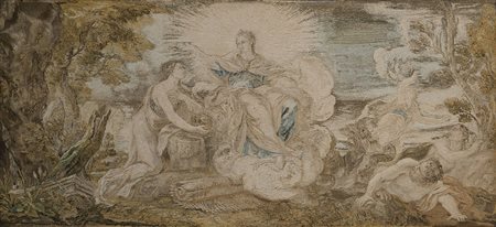 Lotto 2 Arte del secolo XVIII. "Scena mitologica" tessuto (cm 33x75)In cornice (difetti) 18th -century art. (Mythological scene) Framed (defects)