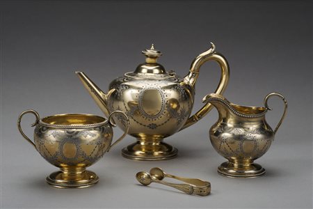 Lotto 3 Servizio da tè in argento dorato composto da: teiera, lattiera, zuccheriera e pinza, decorato con festoni, ghirlande stilizzate e bordure perlinate. Londra, 1868. Argentiere Henry Holland (gr tot 590 ca) (h. teiera cm 14) Gilt silver tea set. London, 1868