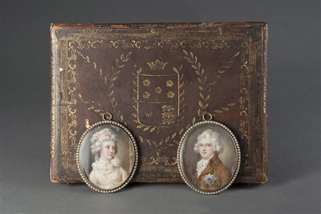 Lotto 4 Firma indecifrata fine sec. XVIII "Gentiluomo e gentildonna" coppia di miniature su avorio (cm 6x5) in cornici in oro basso con profili decorati da perline. Custodia in marocchino impressa in oro con stemma nobiliare entro cornice a foglie e volute (difetti) "Nobleman and noblewoman" pair of late 18th-century miniatures on ivory (defects)