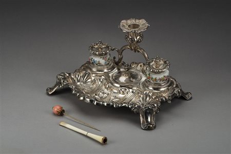 Lotto 5 Calamaio in argento e porcellana dipinta, di forma rettangolare sagomata, decorato a conchiglie, volute e foglie. Campanello a leva inserito nella base. Milano, Ceppi Francesco, seconda metà XIX secolo. In custodia (gr lordi 490) (cm 19x24x14) (difetti) Rectangular silver and painted porcelain inkwell. Second half of the 19th century (defects)