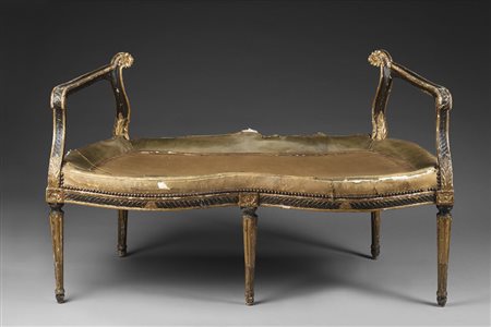 Lotto 6 Panchetto in legno intagliato, laccato e dorato, a motivi vegetali e rosoni. Gambe tornite e scanalate. Fine sec. XVIII (difetti) Carved and lacquered gilt-wood bench. Late 18th century (defects)
