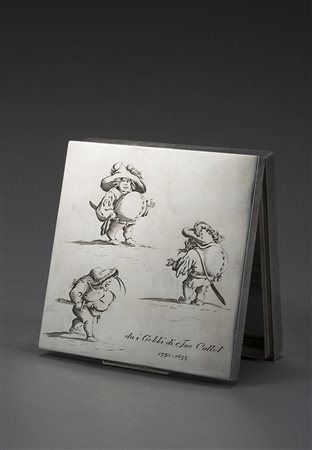 Lotto 10 Portasigarette in argento a corpo zigrinato e coperchio inciso con figure ed iscrizione "da i Gobbi di Jacques Callot". Firma Buccellati incisa a bulino. Italia, anni '20 (cm 10x10x2) (gr 220 ca) (lievi graffiature) Silver cigarette case. Italy, 1920s (minor scratches)