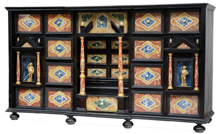 Lotto 11 Monetiere in ebano a otto cassetti riquadrati da cornici guillochet, pannelli dipinti a finti marmi policromi, due grandi laterali di struttura architettonica con cimasa a timpano e decorati da sculture in legno dorato. Parte centrale con cassetto alla base sormontato da colonne a tutto tondo e cinque cassetti riquadrati da sagome e cassetto superiore riquadrato da cornici. Pomoli in avorio, piedi a sfera schiacciata. In parte del sec. XVII (cm 124x70x39)(difetti) Ebony cabinet. Partly of the 17th century (defects)