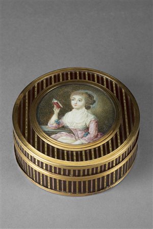 Lotto 12 Tabacchiera di forma tonda con coperchio decorato da miniatura raffigurante gentildonna. Corpo in tartaruga con striature in oro rosa e giallo. Sec.XVIII (gr 44,60) (difetti) 18th-century gold-mounted blond tortoiseshell portrait snuff box (defects)