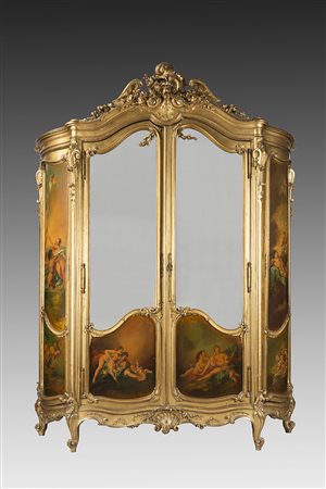 Lotto 17 Armadio eclettico di forma bombata a quattro ante di cui quelle centrali a specchi e laterali dipinte a scene mitologiche. Cimasa intagliata e traforata a fiori e faretra. Montanti scolpiti a motivi vegetali (cm 210x275x55) (difetti) Painted wooden wardrobe (defects)