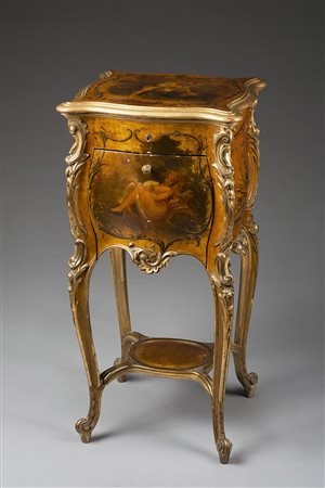 Lotto 18 Comodino da centro con montanti e profili dorati, fronte e ripiano dipinti a scene mitologiche. Pianetto apribile celante vano e specchio. Anta ribaltabile con interno lastronato in marmo (cm 46x88x46) Beside table with gilt details