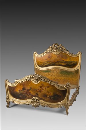 Lotto 19 Letto eclettico a due piazze in legno scolpito e dorato, con spalliera e pediera dipinte con scene allegoriche. Inizio sec. XX Early 20th-century sculptured gilt-wood bed