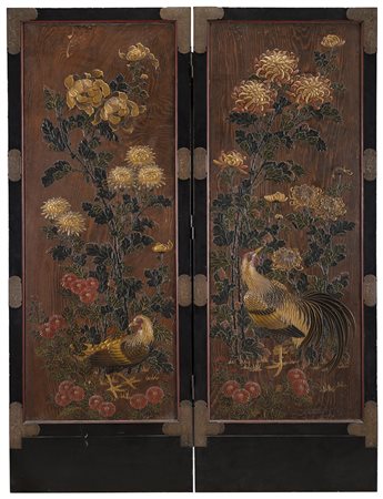 Lotto 21 Paravento da centro a due ante in legno laccato e dorato in policromia a fiori e volatili. Cornice in legno ebanizzato decorato da applicazioni in rame inciso a motivi vegetali. Giappone, sec. XIX (difetti e mancanze) (cm 175x130) 19th-century Japanese lacquered gilt-wood screen (defects and minor losses)
