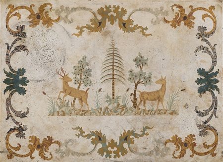 Lotto 22 Tavolo da centro lastronato in mogano e piuma di mogano. Piano in scagliola decorato da cervi in una foresta incorniciata da girali. Gambe mosse unite da ripiano. Toscana, sec. XIX (cm 59x78,5x46) (difetti) 19th-century Tuscan mahogany table with scagliola top (defects)